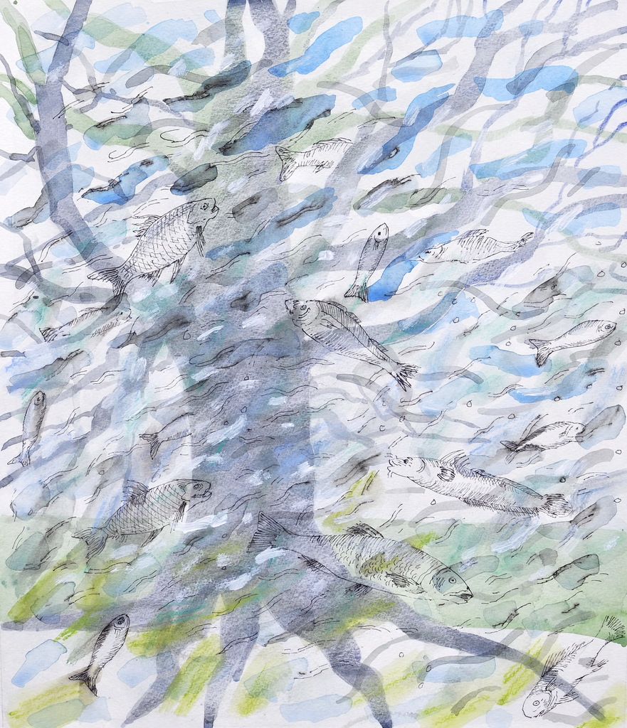 Werk gemaakt voor de biennale Noord Holland 2016, met als thema: Wassend Water. Basis van het werk is een aquarel, waarin getekend is met O.I. Inkt.