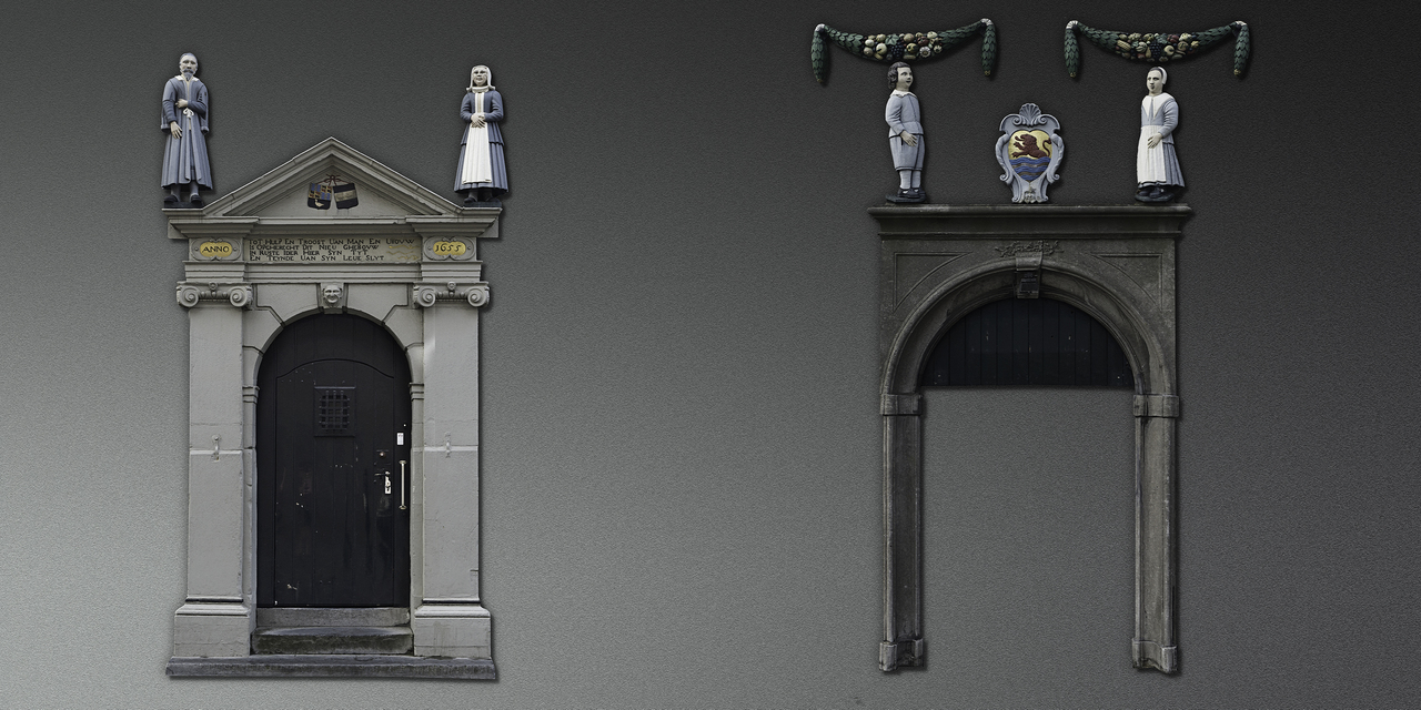 Ingang Manhuis (1655) en Burgerweeshuis aan de Zusterstraat TOT HULP EN TROOST UAN MAN EN UROVW IS OPGHERECHT DIT NIEU GHEBOVW IN RUSTE IDER HIER SYN TYT EN TEYNDE UAN SYN LEUE SLYT