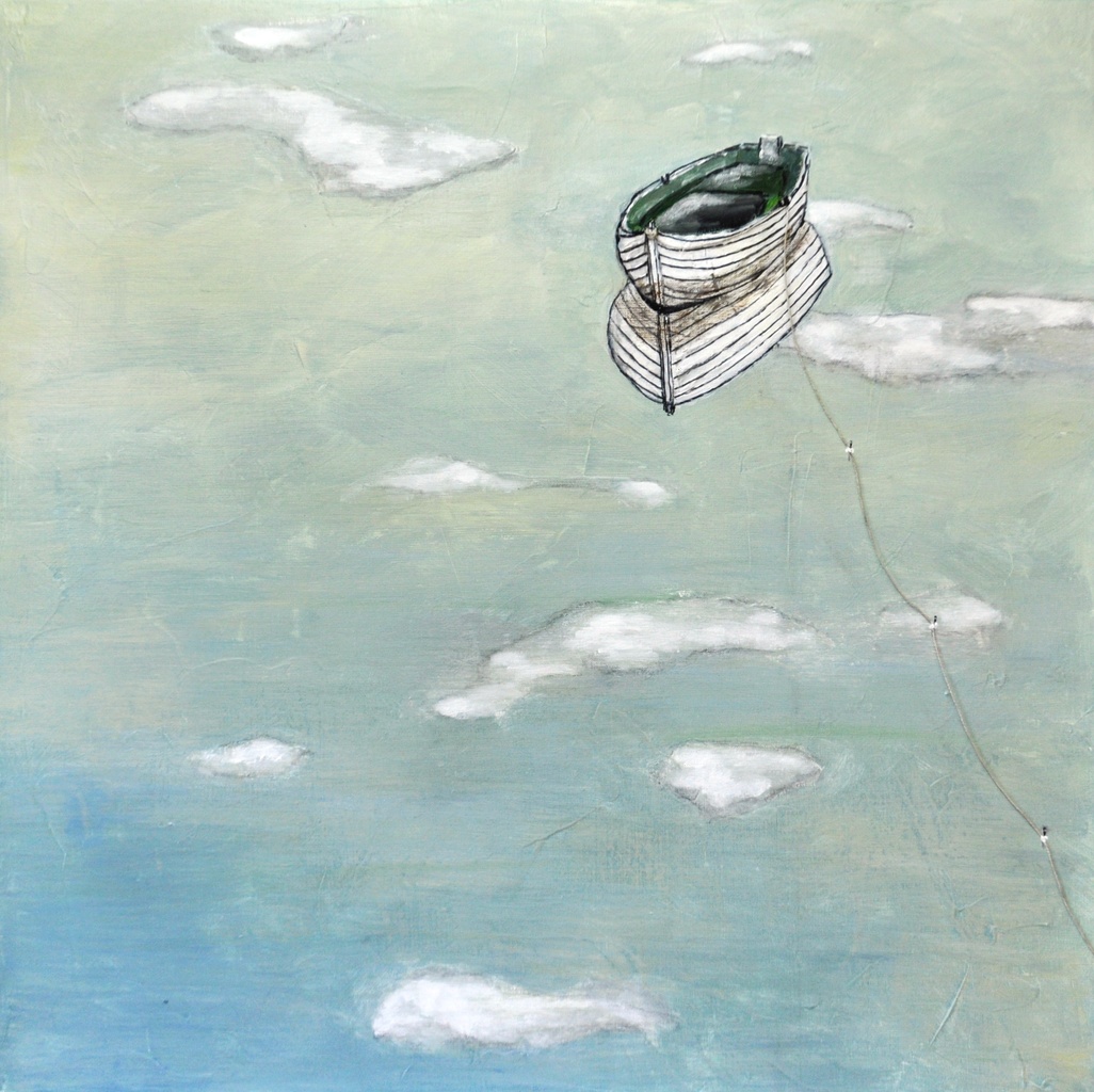 Wit Grijs Acryl Wolken Groen Water Doek Lucht Lichtblauw Touw Zweven Drijven Boot Roeiboot Lichtgeel Dobbers