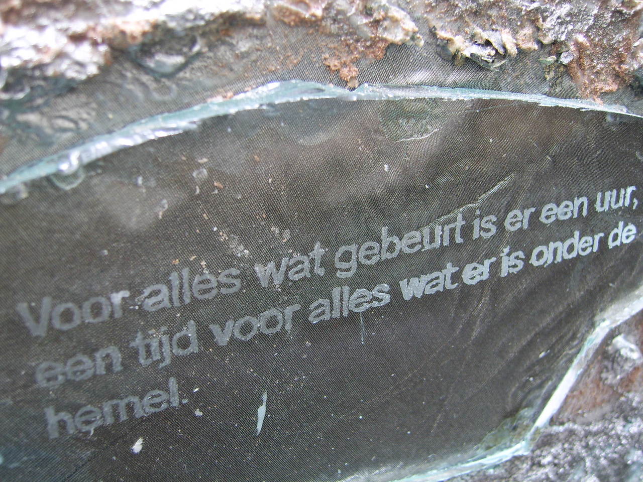 Fotokaart van het kunstwerk ' Alles heeft zijn tijd''. Tekst: Voor alles wat gebeurt