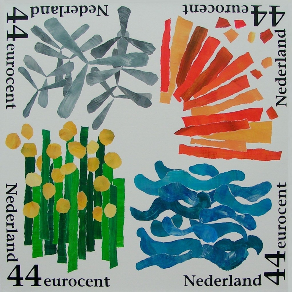 Collage op doek met gescheurd papier beschilderd met acrylverf. Oorspronkelijk ontwerp voor postzegel, later in opdracht uitvergroot.
