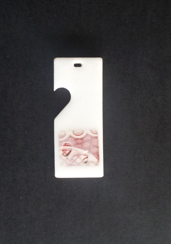 Combinatie van witte giethars met een scherf rood aarde werk (delfts rood) erin gegoten.