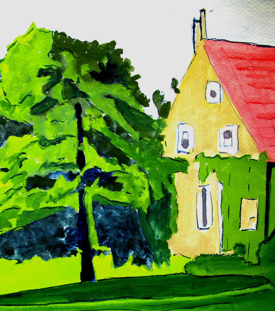 Lucht Huis Dak Gevel Ramen Boom Groen Bladeren