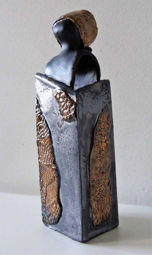 Puber meisje met kant bekleed in amber. Onderkant zwart, lichaam en gezicht mat zwart.