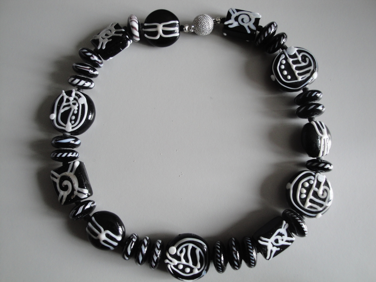 zwartwitte glaskralen in verschillende vormen; magneetslot; lengte 46 cm.