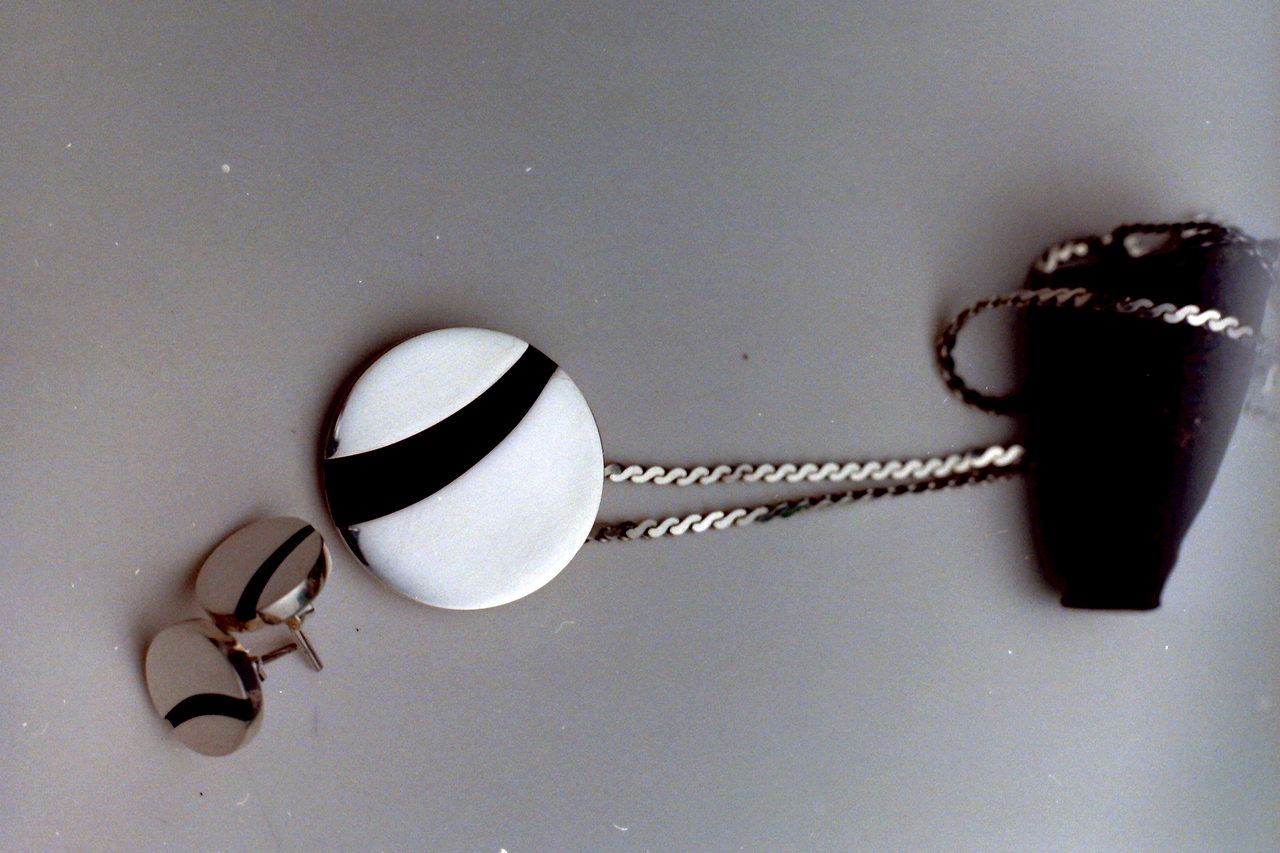 Hanger met ketting (verkocht). Zilver deels zwart gepatineerd. 3mm dik op 25mm diameter (eventueel met bijpassend paar oorbellen: zie Oorbel 9)