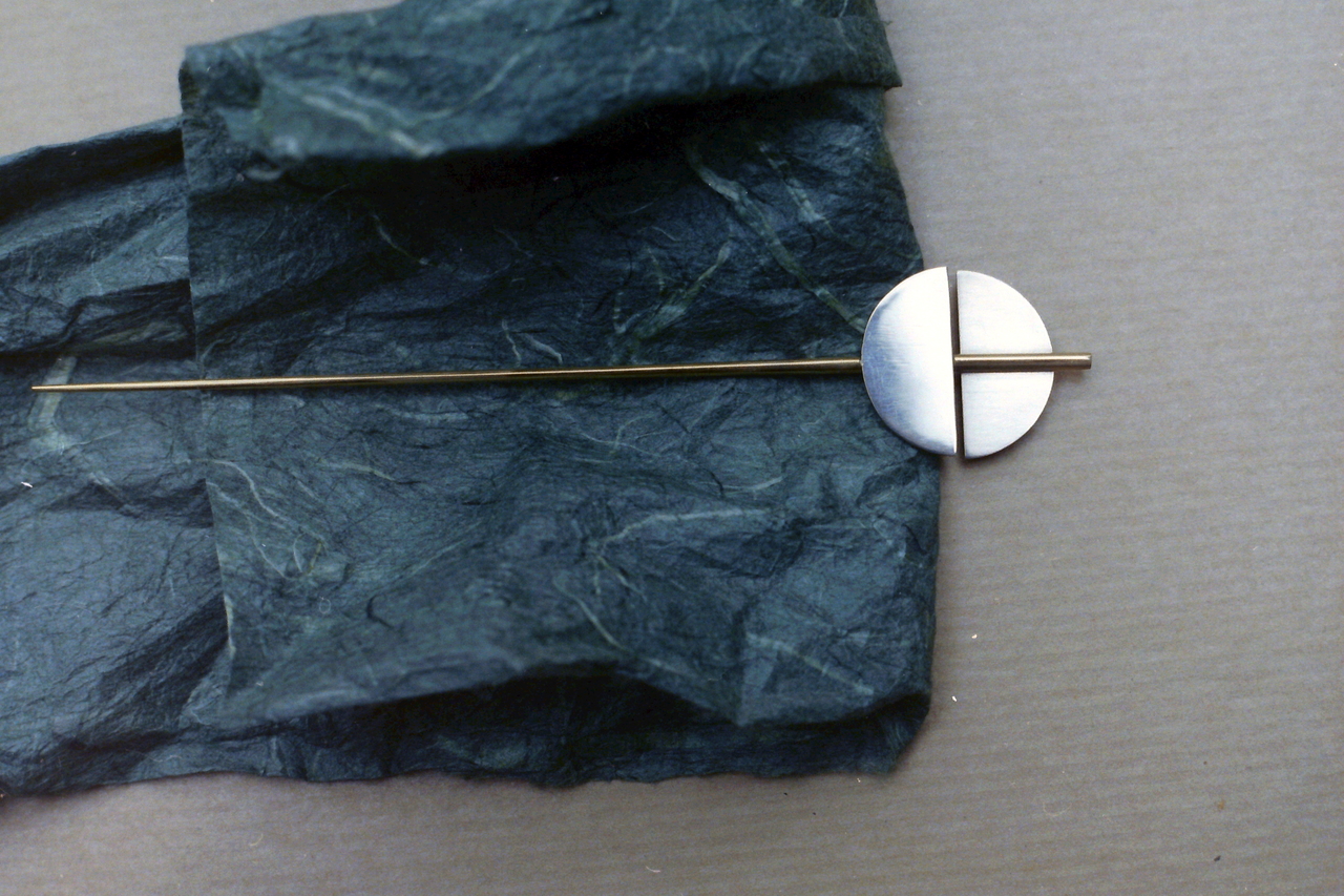 Broche. Zilver met pin in messing. 120mm totale lengte. 23mm diameter