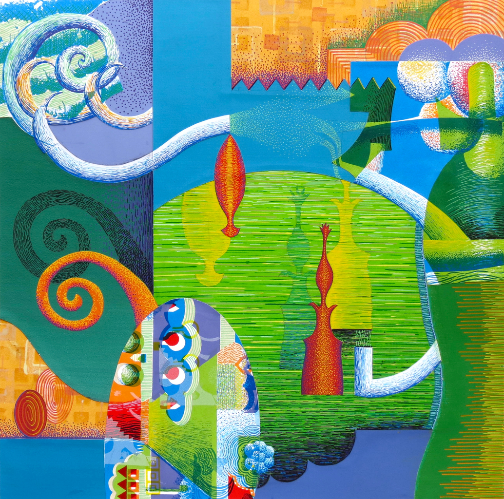 Mijn werk is zeer kleurrijk. Ik balanceer graag op de grens tussen figuratief en abstract, waarbij ik mijn eigen droomwereld creeer. Mijn inspiratie haal ik uit de natuur en het materiaal.