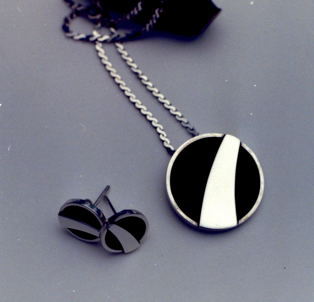 Hanger (nog beschikbaar) met bijpassende oorbellen (reeds verkocht). Zilver, deels zwart gepatineerd. 25mm diamater