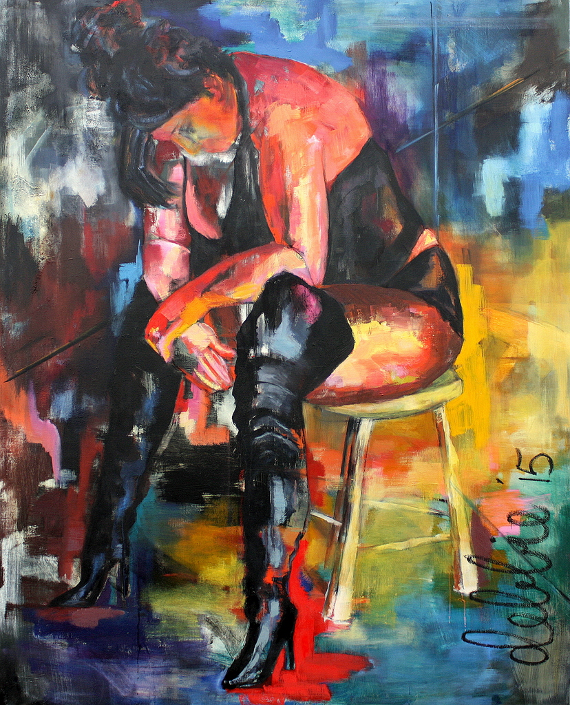 Zit je er bij een kantoorbaan soms helemaal doorheen? In dit vak zal het niet anders zijn. Na een drukke dag zakt de moed ook haar in de schoenen. Omkleden, naar huis en al dan niet naar haar gezin. De dag zit er op. De verzadigde kleuren maken het beeld expliciet.