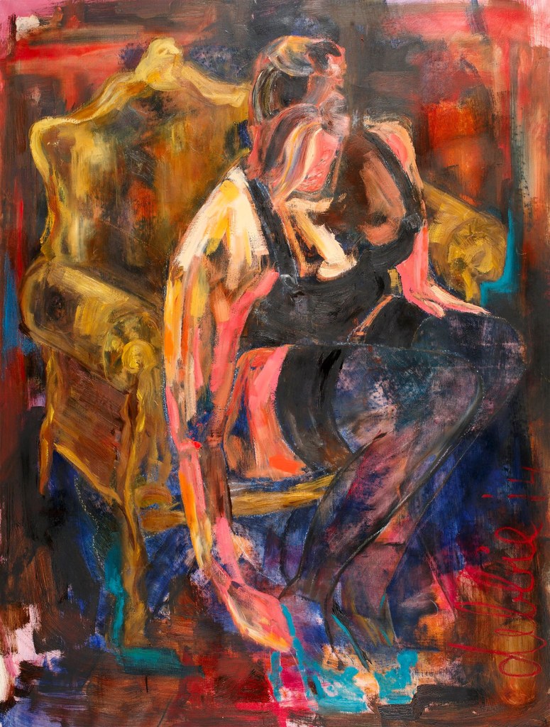 Een ogenschijnlijk onbespied moment. Nog even de hakken goed en alles klaar voor een normale dag achter het raam. Dit intieme moment vroeg om een warm zacht palet. Dit schilderij was door de jury gekozen om tentoongesteld te worden tijdens de Zomerexpo 2015 'Woest' in het Gemeentemuseum Den Haag.