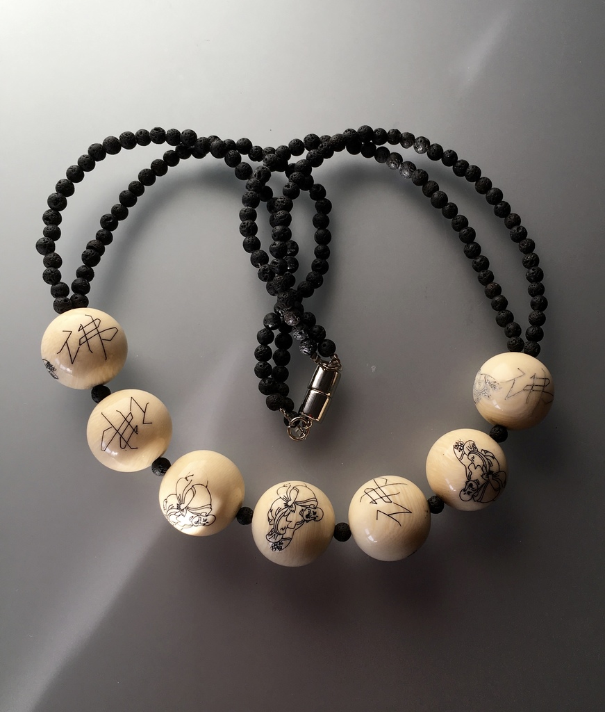 Oude kralen van Been, met een prachtige afbeelding op de kraal. De zwarte kralen zijn van lava.
