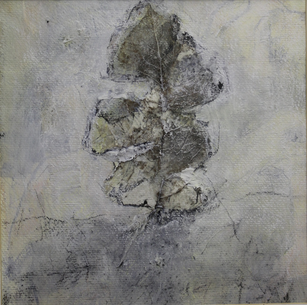 halfvergaan eikeblad achter glas, ingelijst. formaat 29 x 29 cm