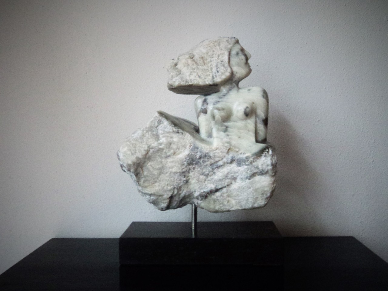 De zeemeermin is ontstaan uit een stuk speksteen. Het beeld is gedeeltelijk ruw gelaten. De sokkel is van hardsteen. verkocht.