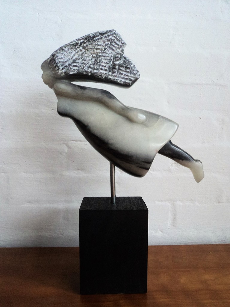 "dochter vliegt uit" heb ik gemaakt voor mijn dochter die inmiddels alweer een flinke poos zelfstandig woont. Het beeld is van speksteen en staat op een houten voet. niet te koop.