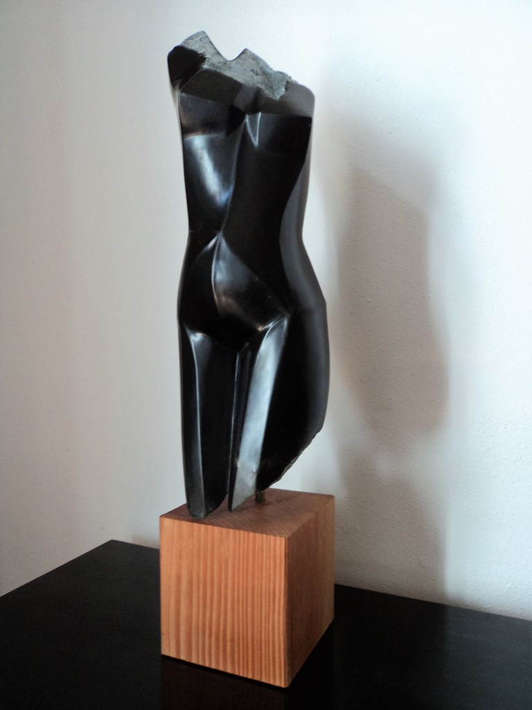Torso met scherpe lijnen van zwart serpentijn op een houten sokkel. verkocht.