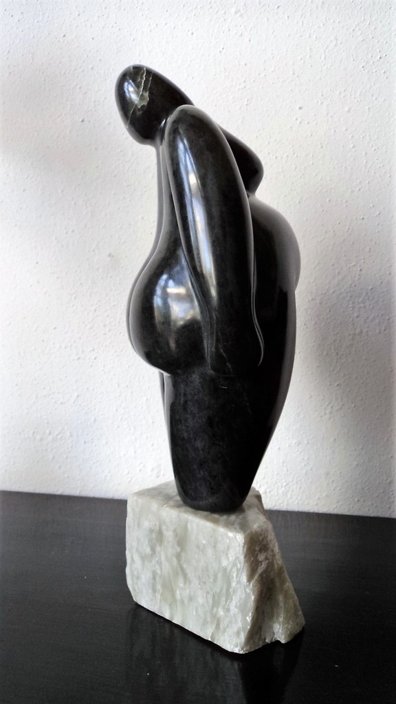 Dikkerdje dat terecht gekomen is bij Piet. Het is mijn eerste dikkerdje, gemaakt van zwart speksteen. Het staat op een sokkel van ruwe steen. verkocht.