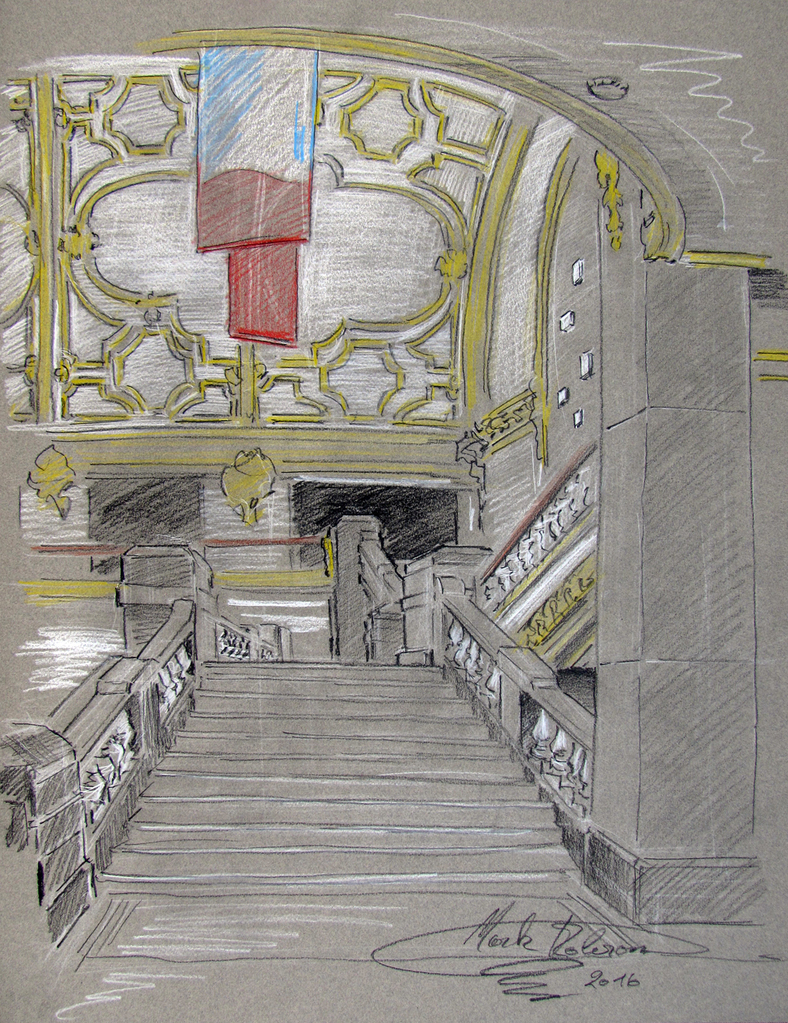 Bij de restauratie van de Antwerpse Stadsfeestzaal is er een grote hoeveelheid bling toegevoegd, wat het oude wow-effect enkel maar vergroot. Voor mij is het heel leuk dat er heel veel licht is. - Pastelpotlood op Cansonpapier.