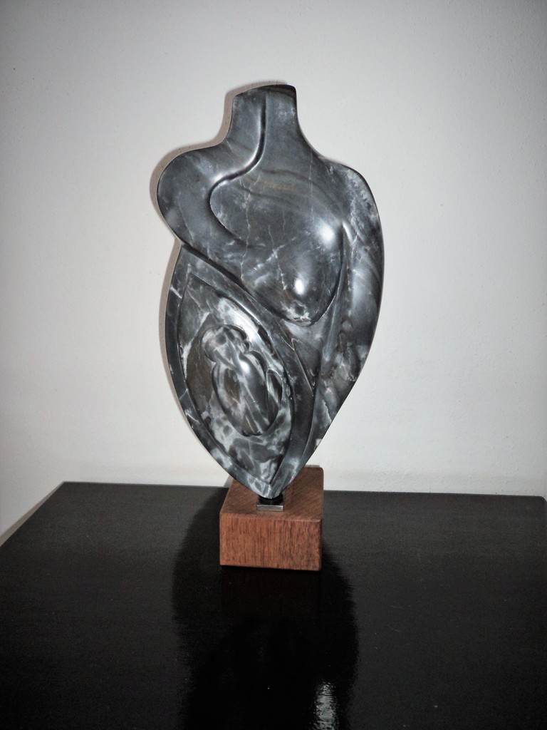Zwangere vrouw met een zichtbaar embryo. Het beeld is gemaakt van zwarte speksteen en staat op een zwarte sokkel. Verkocht.