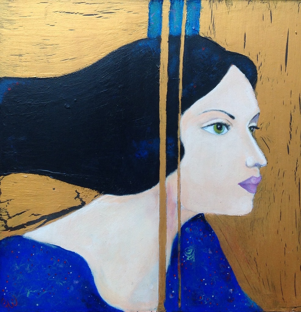 Vrouwenfiguur in acryl op paneel, onderdeel van een tweeluik. Samen in een lijst van een raamkozijn van meer dan 100 jaar oud (zie twee vrouwen I). Prijs is ook voor hen samen, met lijst