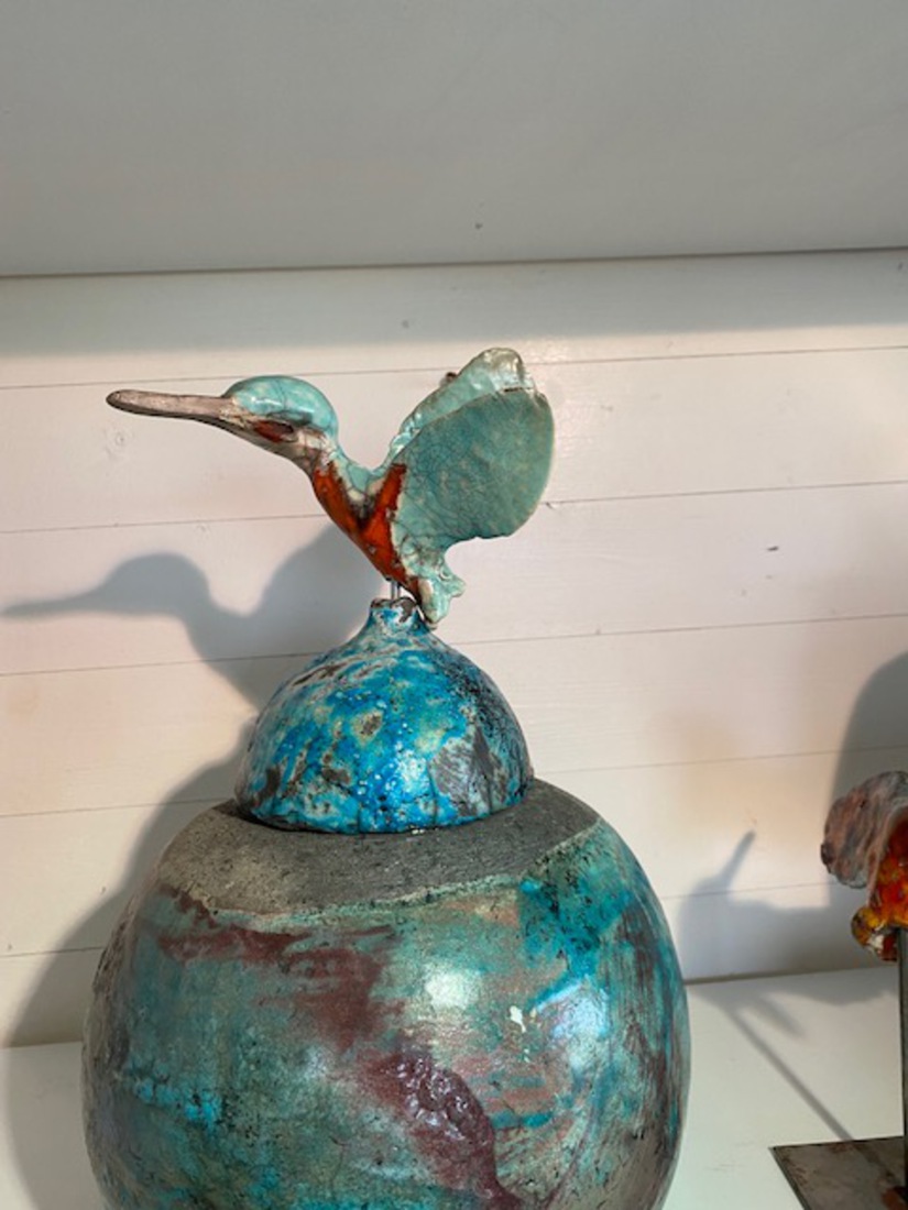 Prachtige sierpot groen/turqoise met ijsvogel Raku gestookt