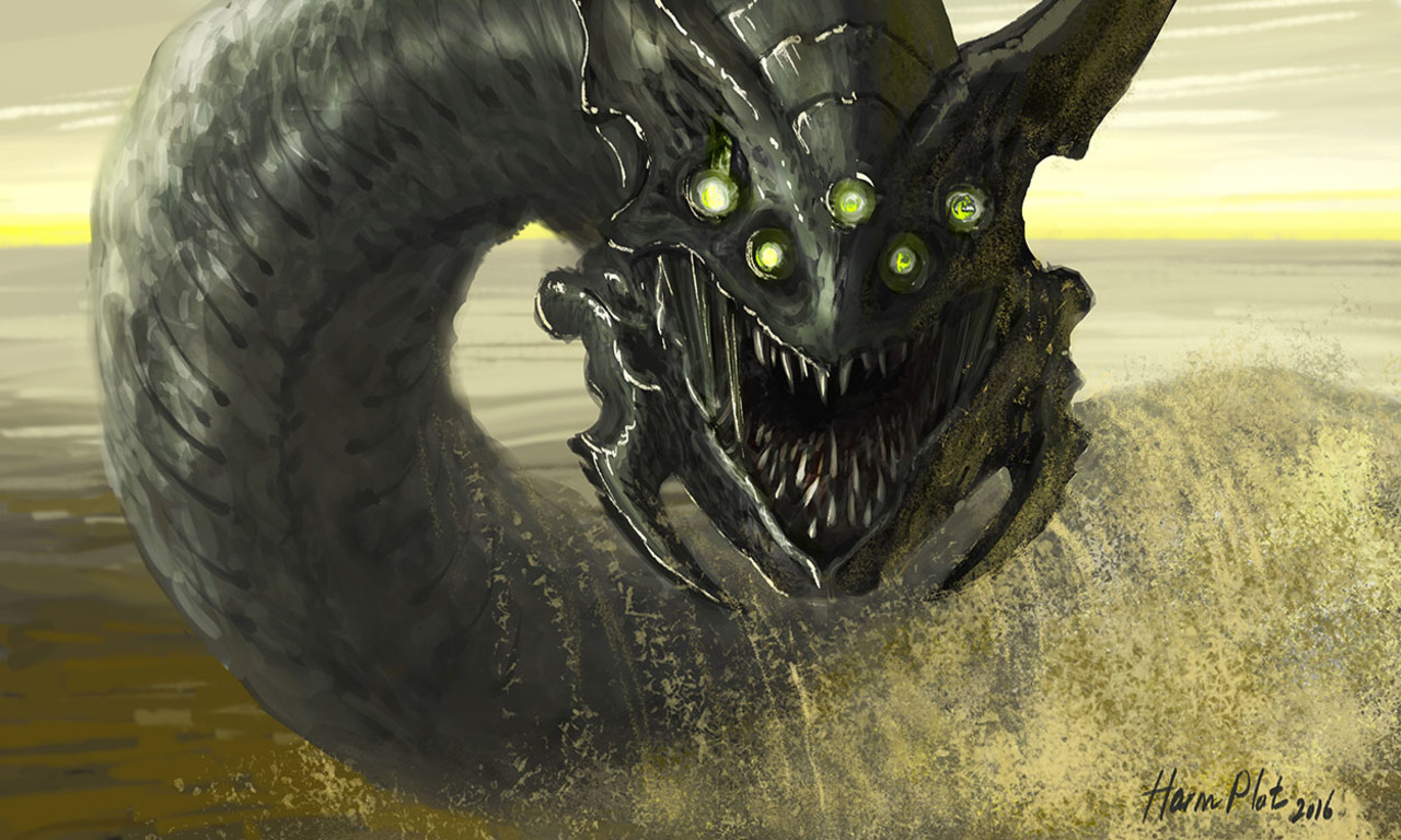 Digitale tekening van een woestijn "wyrm": een draakachtige slang die zich door het zand tunnelt en op de vibraties afkomt van nietsvermoedende reizigers door de woestijn. Fantasy met een beetje horror. Het verhalende aspect van dit soort tekeningen, het ontwerpen van het beest, nadenken over zijn overleving, habitat, etc. is ontzettend leuk om te doen.