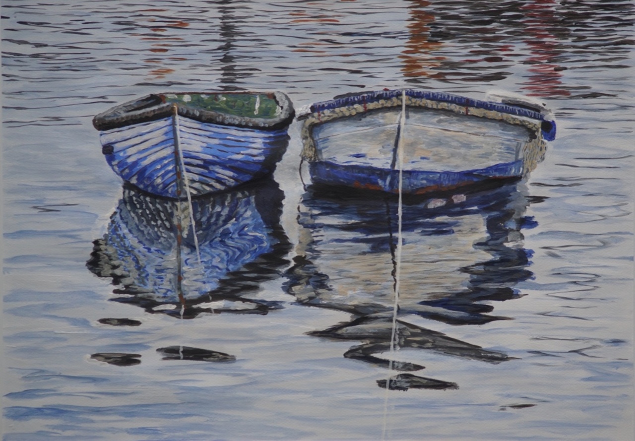 Twee roeibootjes in haven op impressionistische wijze geschilderd