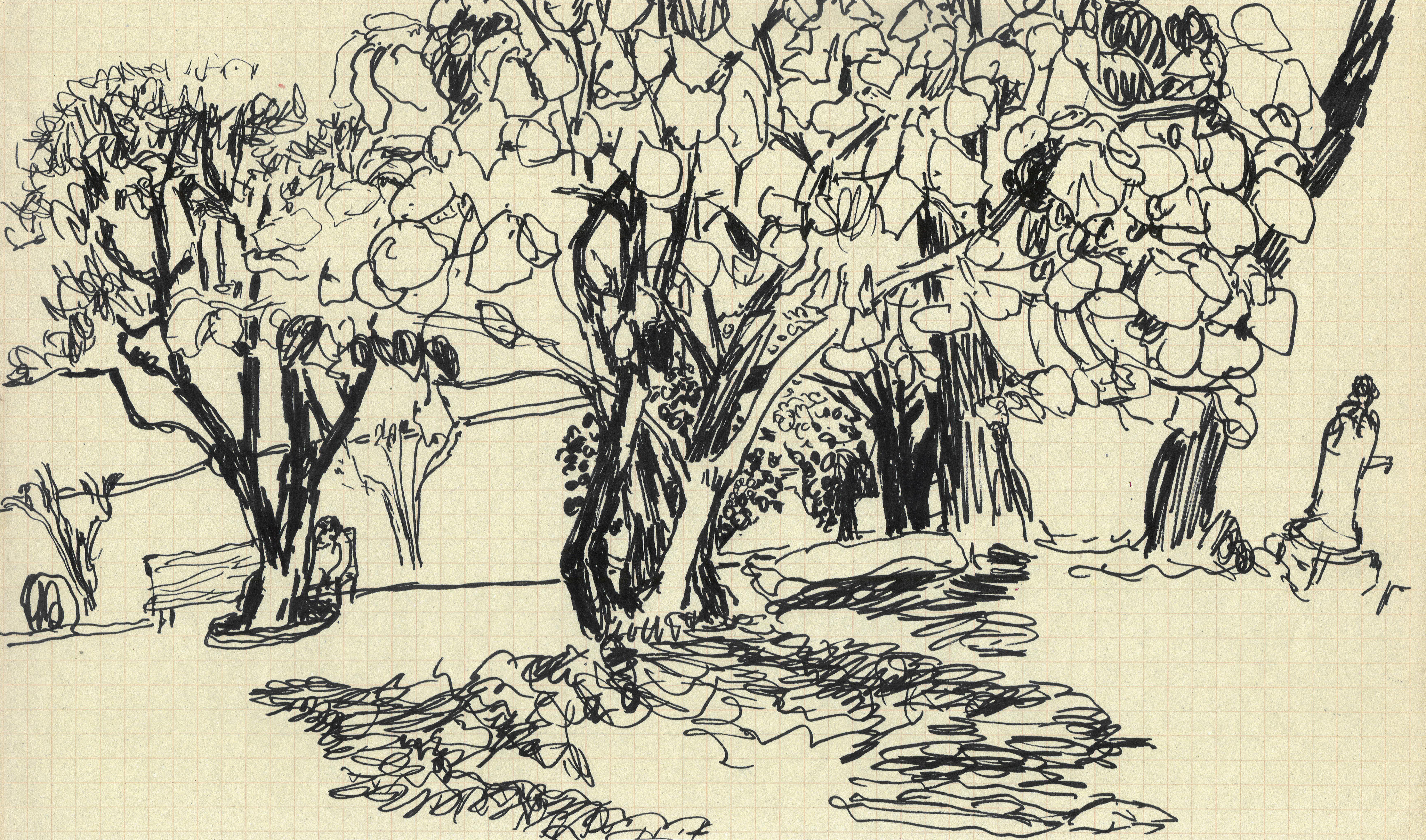 Bomen in steden vind ik vaak zeer bijzondere aanwezigheden. In Barcelona tekende ik er vele. (marker op ruitjespapier).