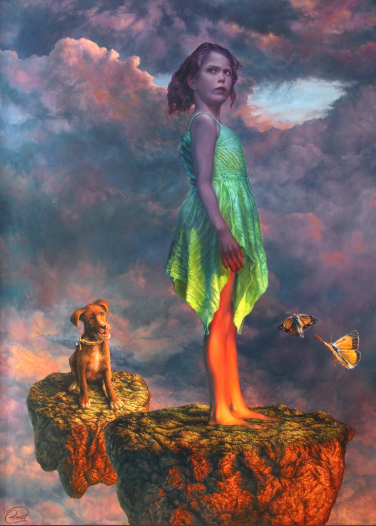 Een meisje staat op een zwevende rots met het hoofd in de schaduw en het licht van de opgaande zon. Niet echt bewust van de omgeving, ziet ze ook niet de pup op een andere rots om aandacht vraagt. Vage schijnbare vleugels verschijnen in relatie tot de dagdroom. Er vliegen vlinders het beeld in die het harmonische " in relatie staan" verbeelden.
