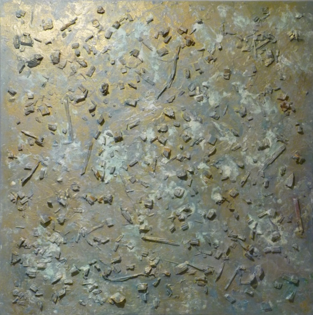 Een werk dat per toeval is ontstaan. De ondergrond is een combinatie van witte behangerslijm, witte acrylverf en een goudverf uit een oude spuitbus. In deze dik opgebrachte laag heb ik houtsnippers gegooid die ik vond tijdens een wandeling op Ameland. Het werk had een aantal dagen droogtijd nodig. Tot mijn verrassing zijn de verschillende materialen waarschijnlijk een chemische verbinding aangegaan waardoor de lichtgroene kleur ontstond.