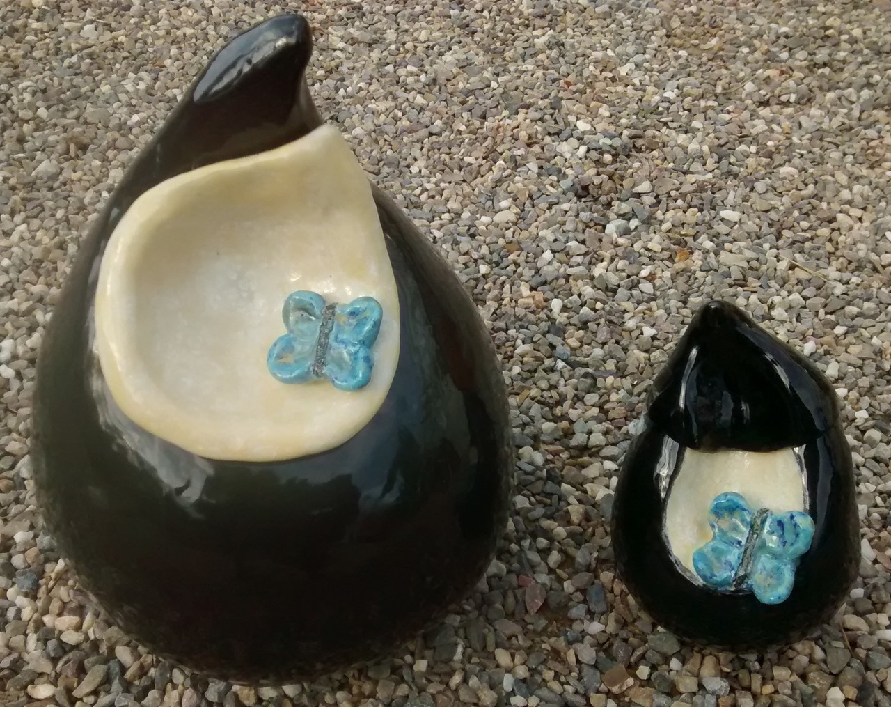 Dit zijn twee urnen van verschillend formaat in de vorm van een druppel. Ze zijn zwart geglazuurd met parelmoer en blauwe vlindertjes. Alleen samen te koop. De kleine is 16x9 cm.