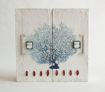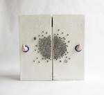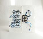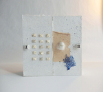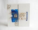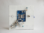 Herinneringsboek Garder vos bras ouverts, attraper les nuages II, heeft een minimalistische uitvoering op de doos. Op het omslag is een abstracte voorstelling van kelpjes te zien van papier met een blauwe binnenzijde. Links en rechts daarvan kleine cijfertjes uit een oude roman. Alle pagina's in het boek zijn te beschrijven, het boek heeft 120 pagina's, gebonden. Het is jammer dat er maar 1 foto te zien is want de doos heeft een hele sfeervolle binnenbekleding en er ligt een uniek, handgemaakt boek in waarvan de pagina's op een speciale manier bewerkt zijn. Als je geïnteresseerd bent, laat een berichtje achter en ik stuur je meer beeldmateriaal toe van dit boek!