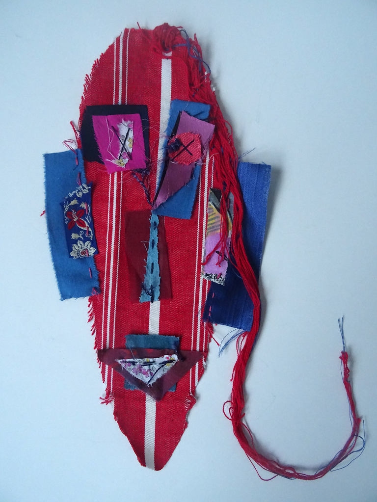Serie van drie maskerachtige portretten. Op stof met handborduurwerk.