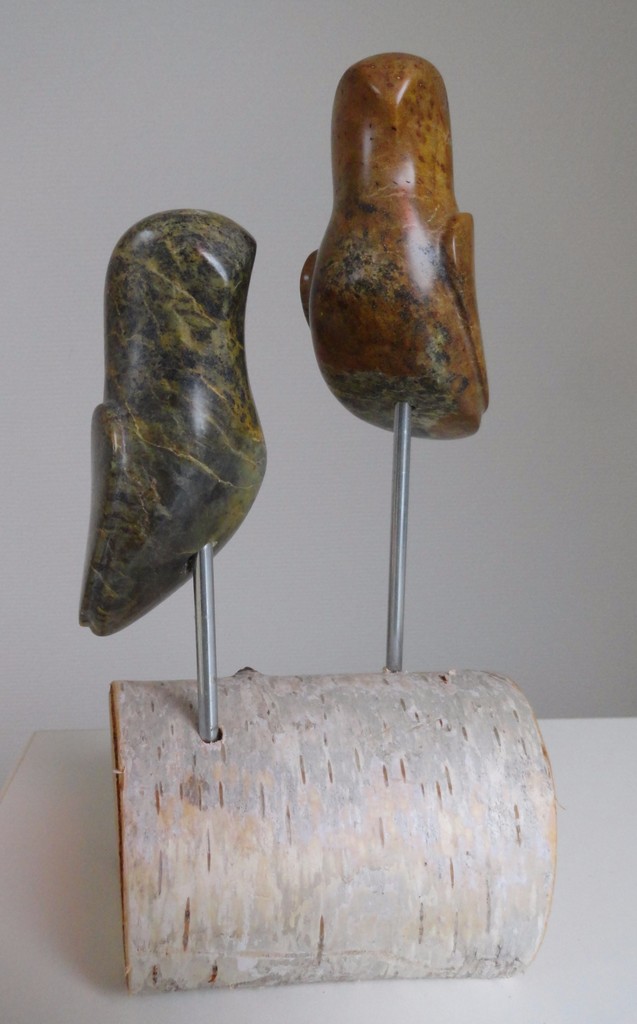 Een vogelechtpaar samen op een tak. De vogels zijn gemaakt van Indiaans Speksteen. De sokkel is een stukje berk.