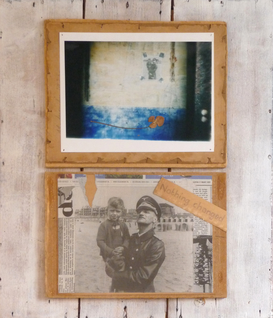 zachtboard, karton, krantenknipsels, foto, gedroogd bloemblad, hout, potlood en verf