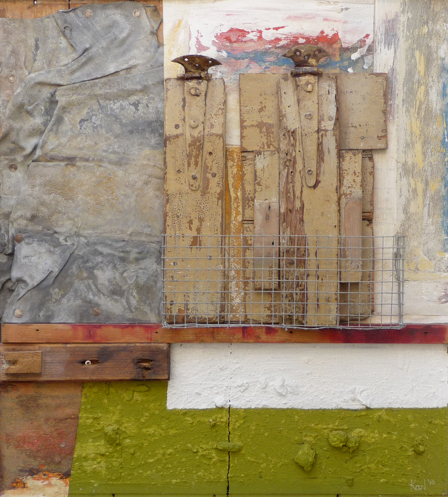 hout, lood, metaal, as, spijkers, papier, doek, kippengaas en verf