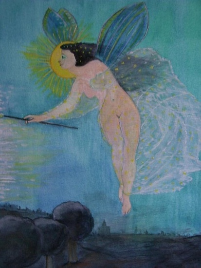 Een reddende engel lijkt het, boven bedreigde en donkere gebieden. Het was een heel klein plaatje van 2x3 cm en ik heb het nageschilderd met mijn eigen interpretatie. Mijn verontschuldiging aan de echte schilder, ik weet geen naam.