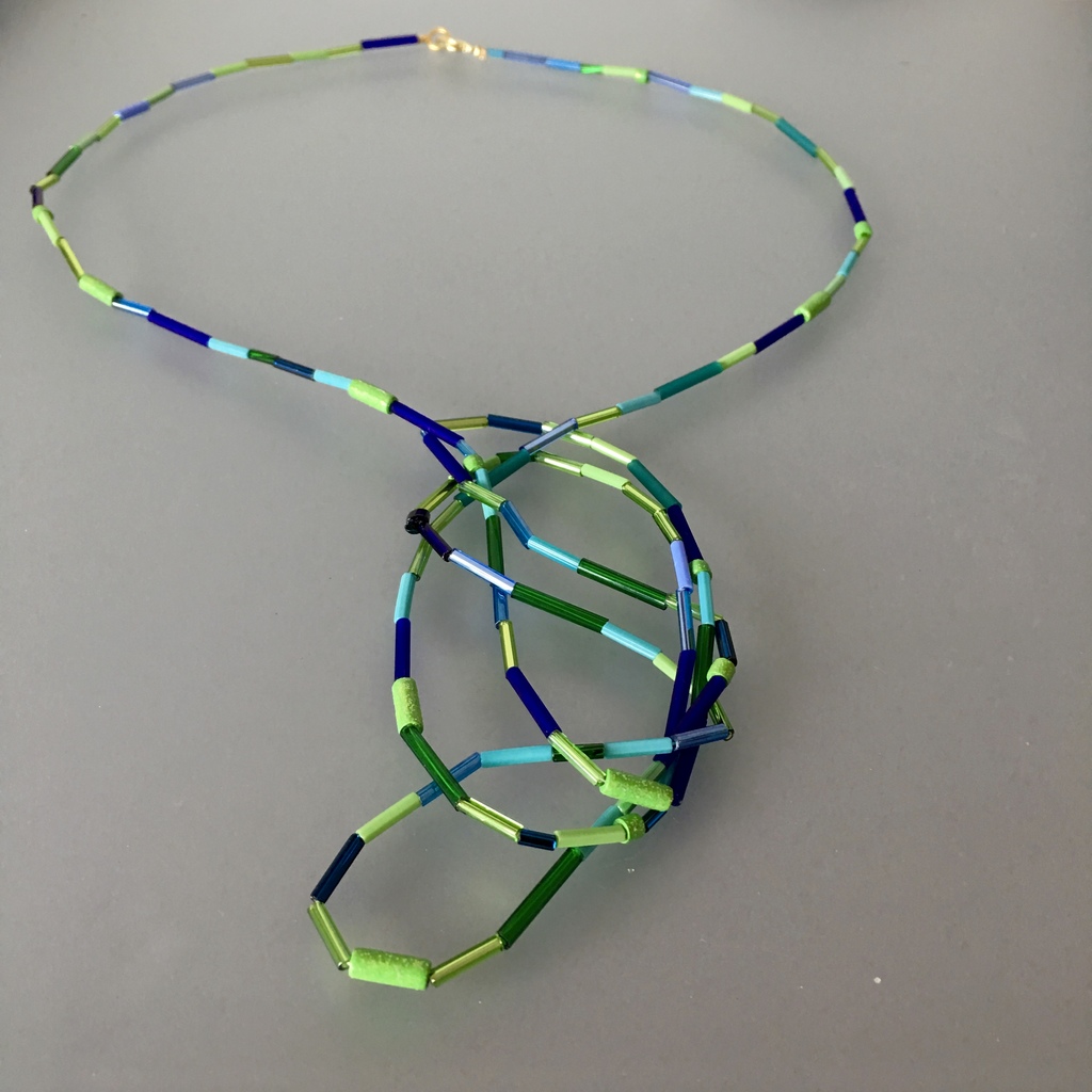 Geschakeerde groen blauw tinten van glas. De ketting is lang en dubbel te dragen. Op de afbeelding zie je de ketting met een knoop erin. Errug leuk.