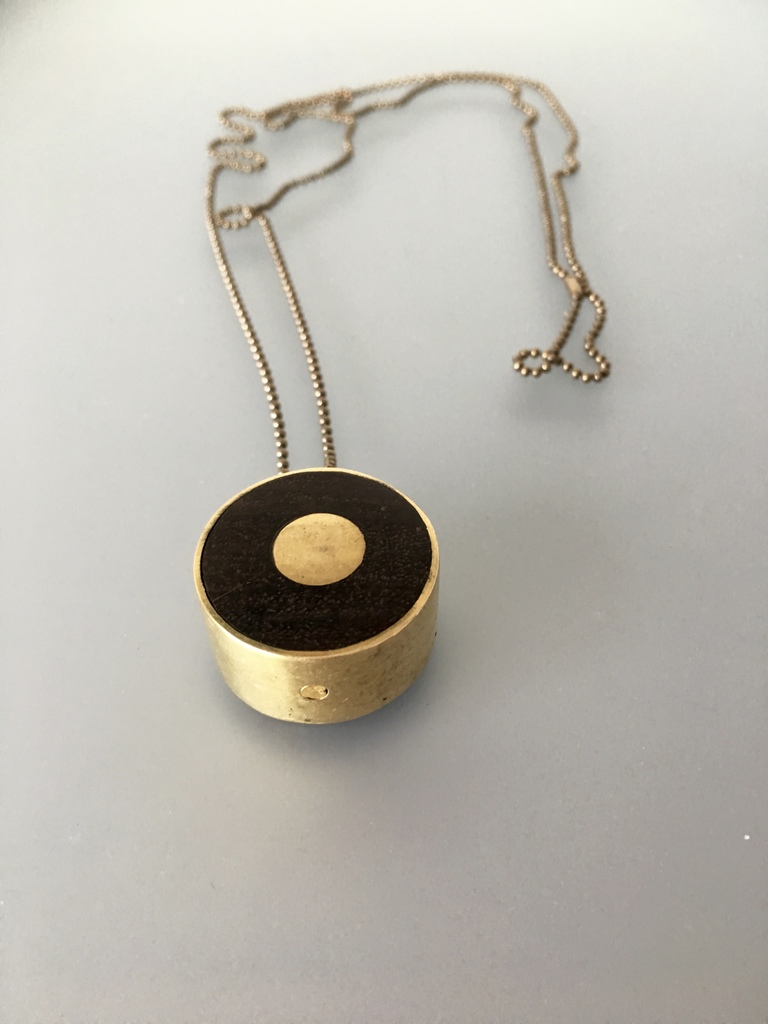 De hanger is van hout en koper. De ketting kun je korter maken.