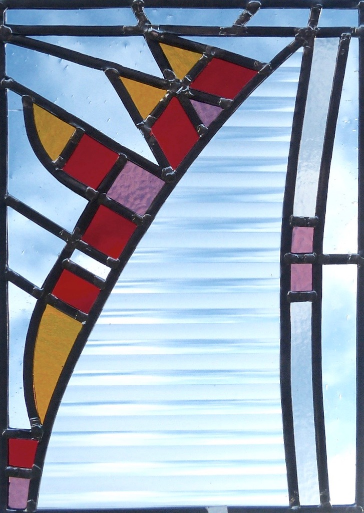 Basis van het paneel is een scherf uit een deur: blank bewerkt glas. Al de glasstukjes zijn gevat in H- of U-lood van 8 mm.