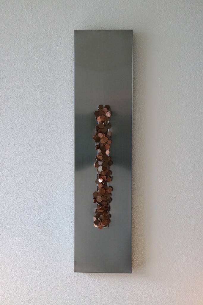 Wandpaneel rvs met magneetstrip waarop munten willekeurig "geplakt" kunnen worden.