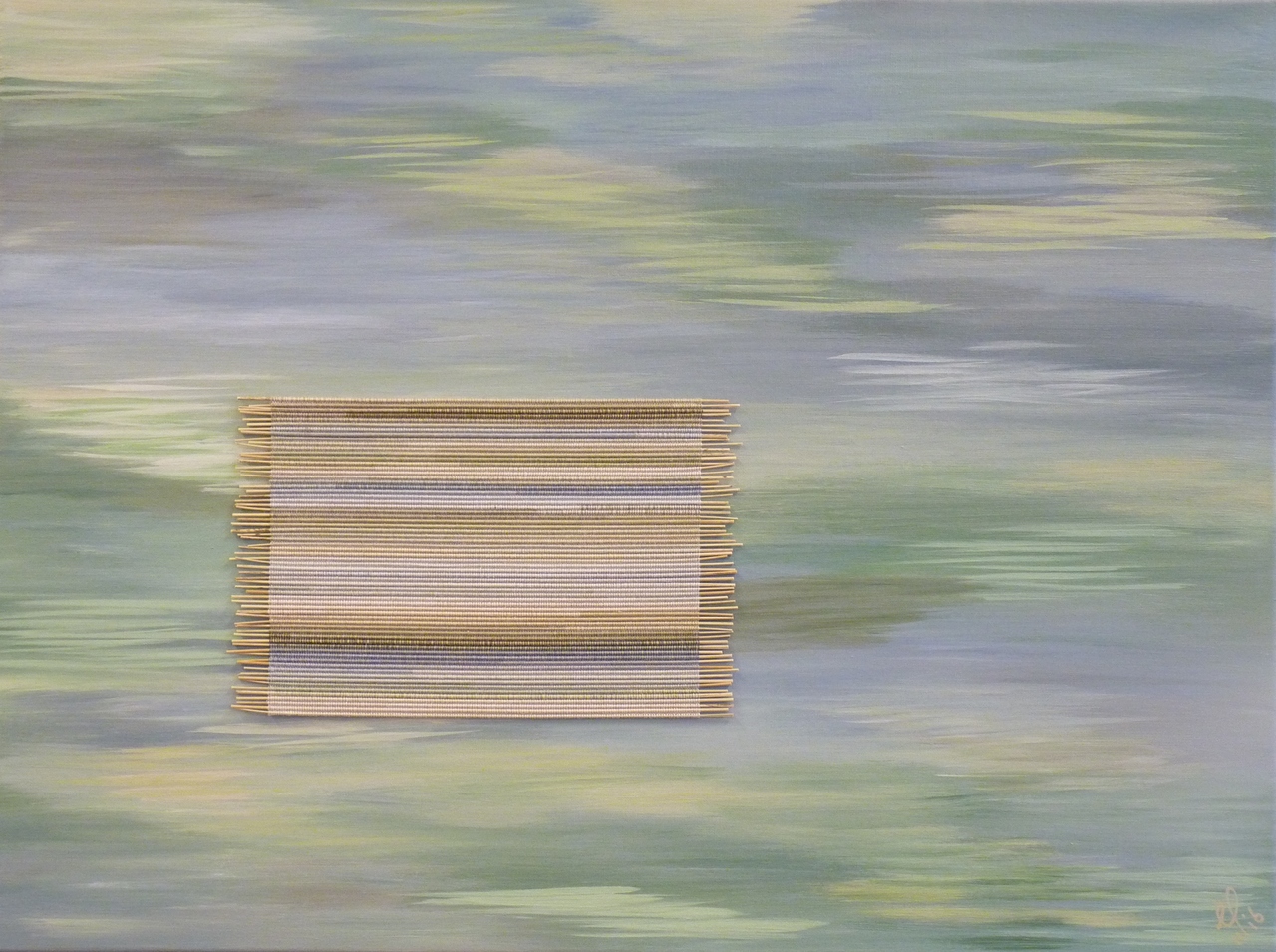Geinspireerd door de natuur op Ameland. Allereerst met zijde sprieten helmgras op aida stof geborduurd. Vervolgens de kleuren zijde via meerdere lagen acrylverf in de achtergrond terug laten komen.