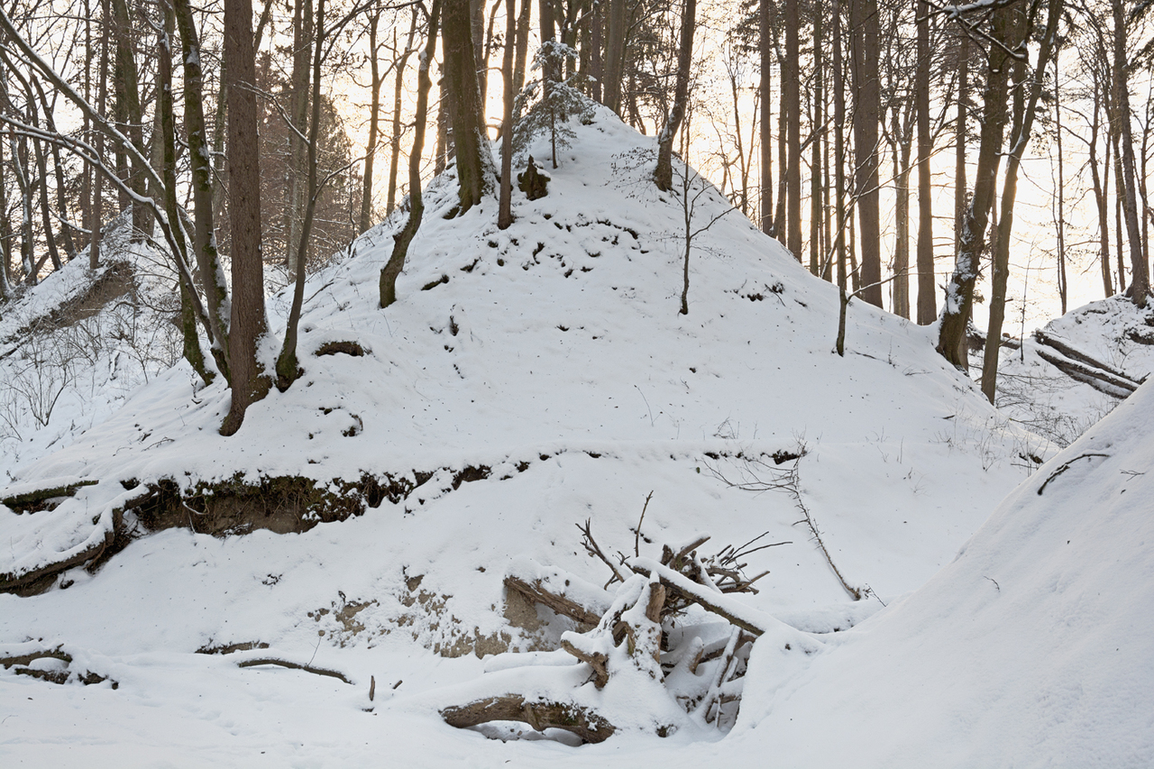 Wit Geel Landschap Zonsondergang Sneeuw Bomen Winter Bos Heuvels Duitsland Beieren Wolfratshausen