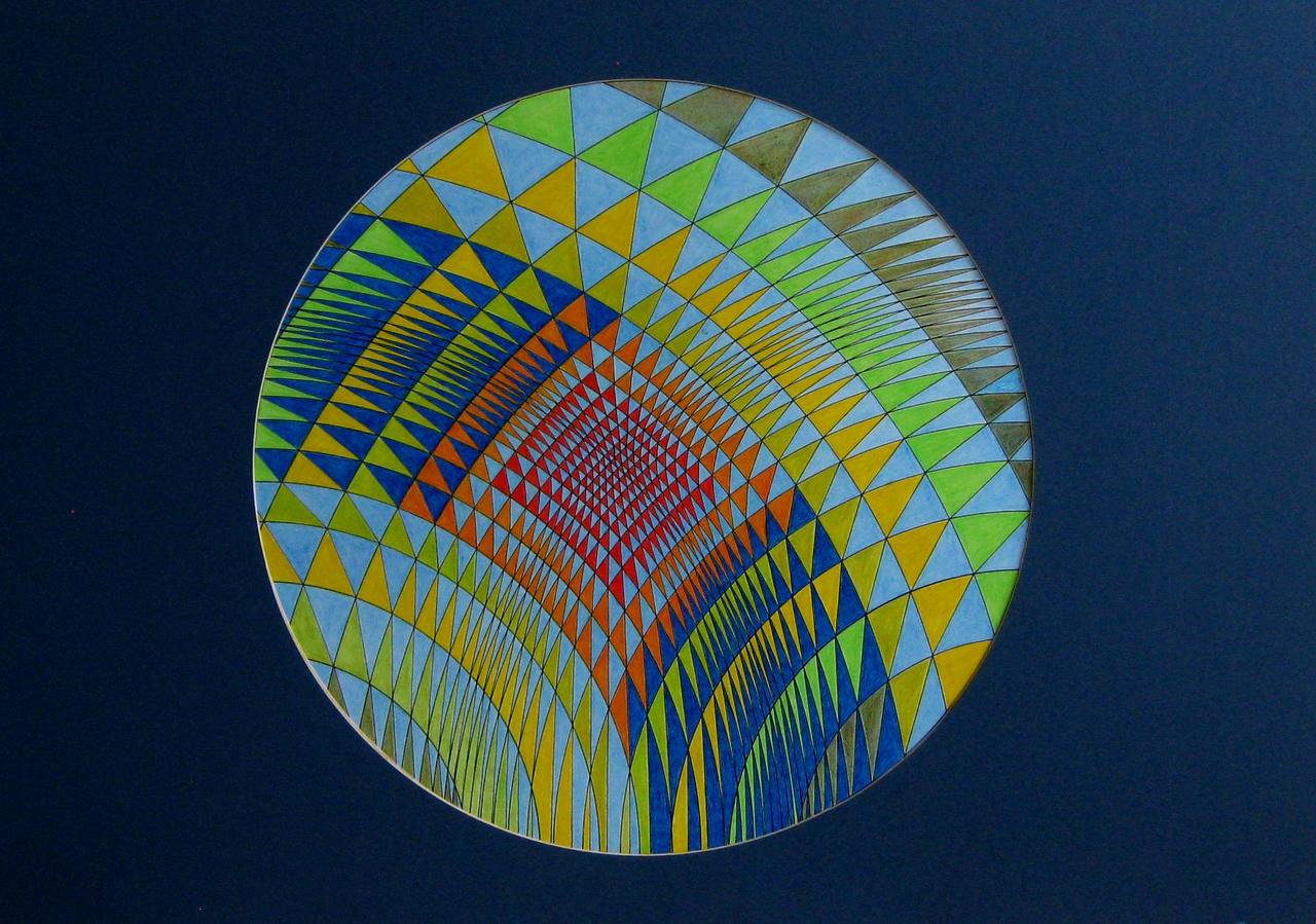 Mathematisch werk 'Sprankeling', uitgevoerd in kleurpotlood op papier in passe partout.
