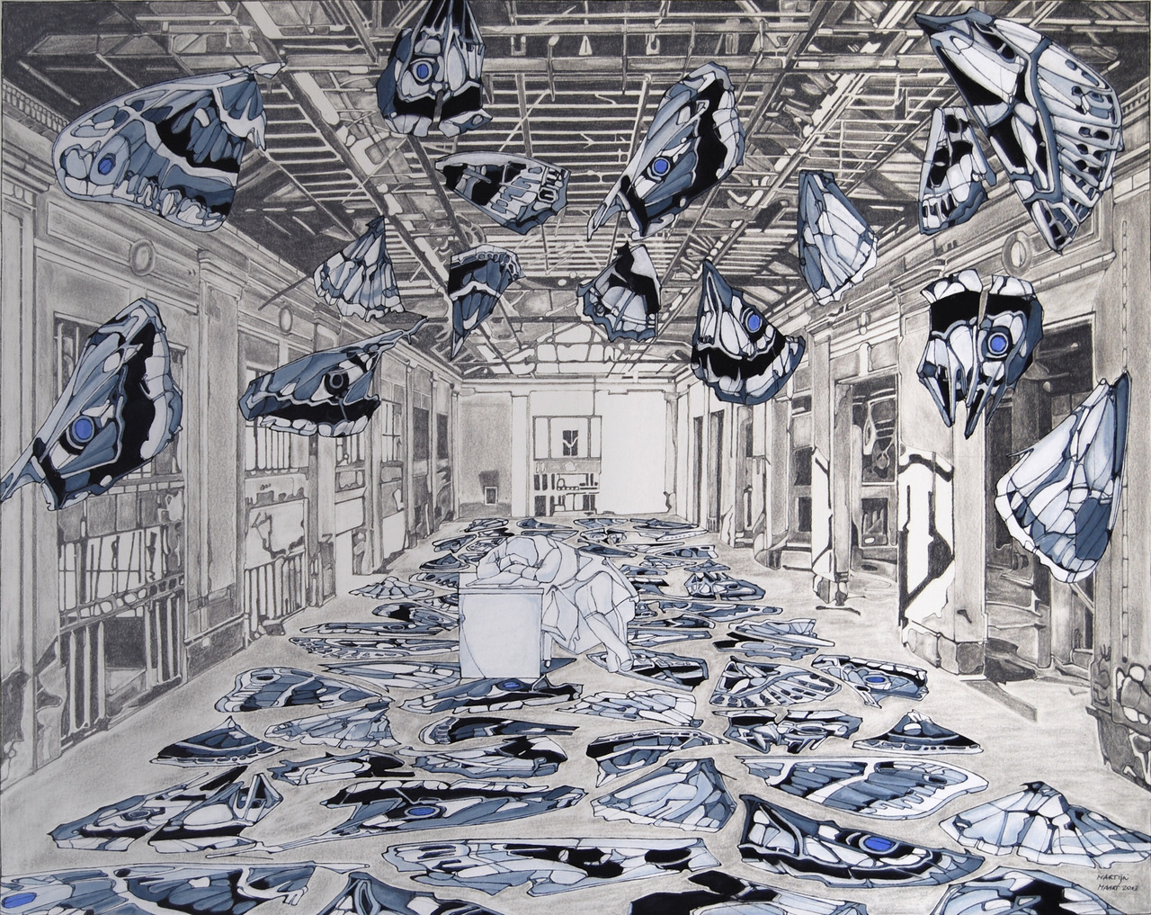 Vlinders De figuur in het centrum is een bewerking van een fragment van een ets van Goya, en vormt de werkelijke titel van dit werk. (potlood - oliepastel - oostindische inkt)