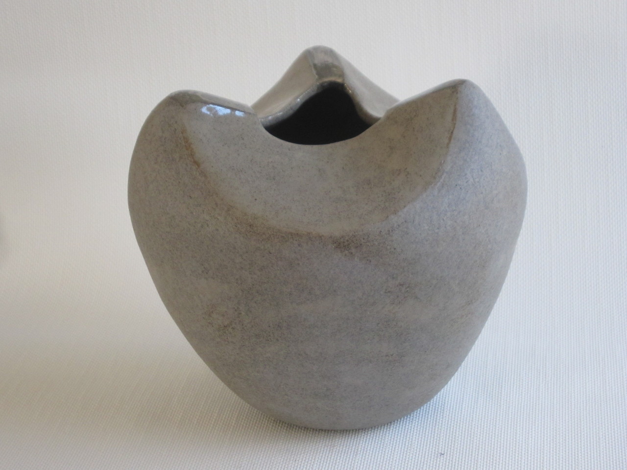 Grijze klei met een combinatie van een matglazuur aan de onderkant en de wave heeft een glansglazuur met platina accenten
