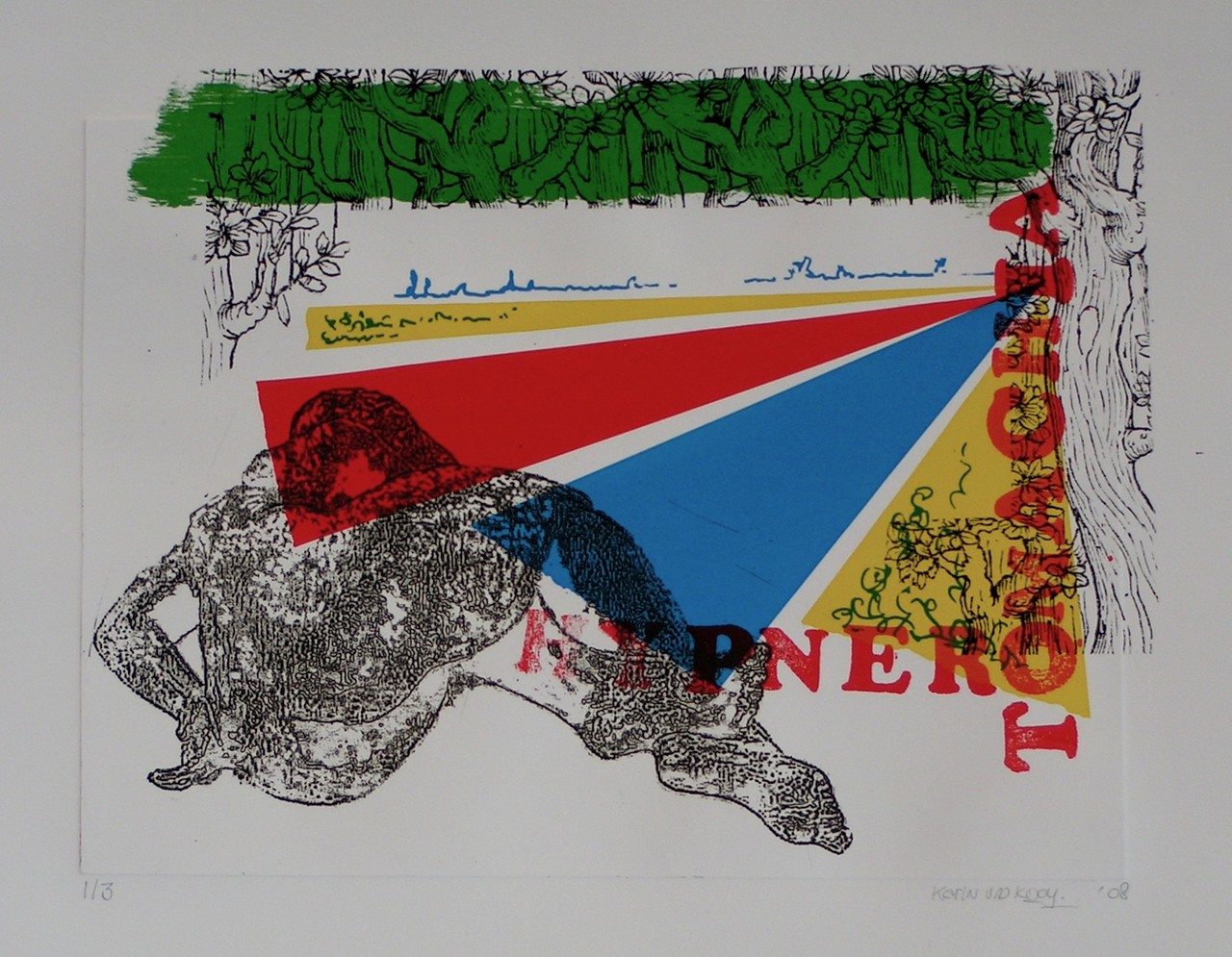 Prent gemaakt naar aanleiding van 15e eeuwse reisavontuur Hypnerotomachia Poliphili van Francesco Colonna en eigen reiservaringen (opdracht KABK). Combinatie van zeefdruk en ets.