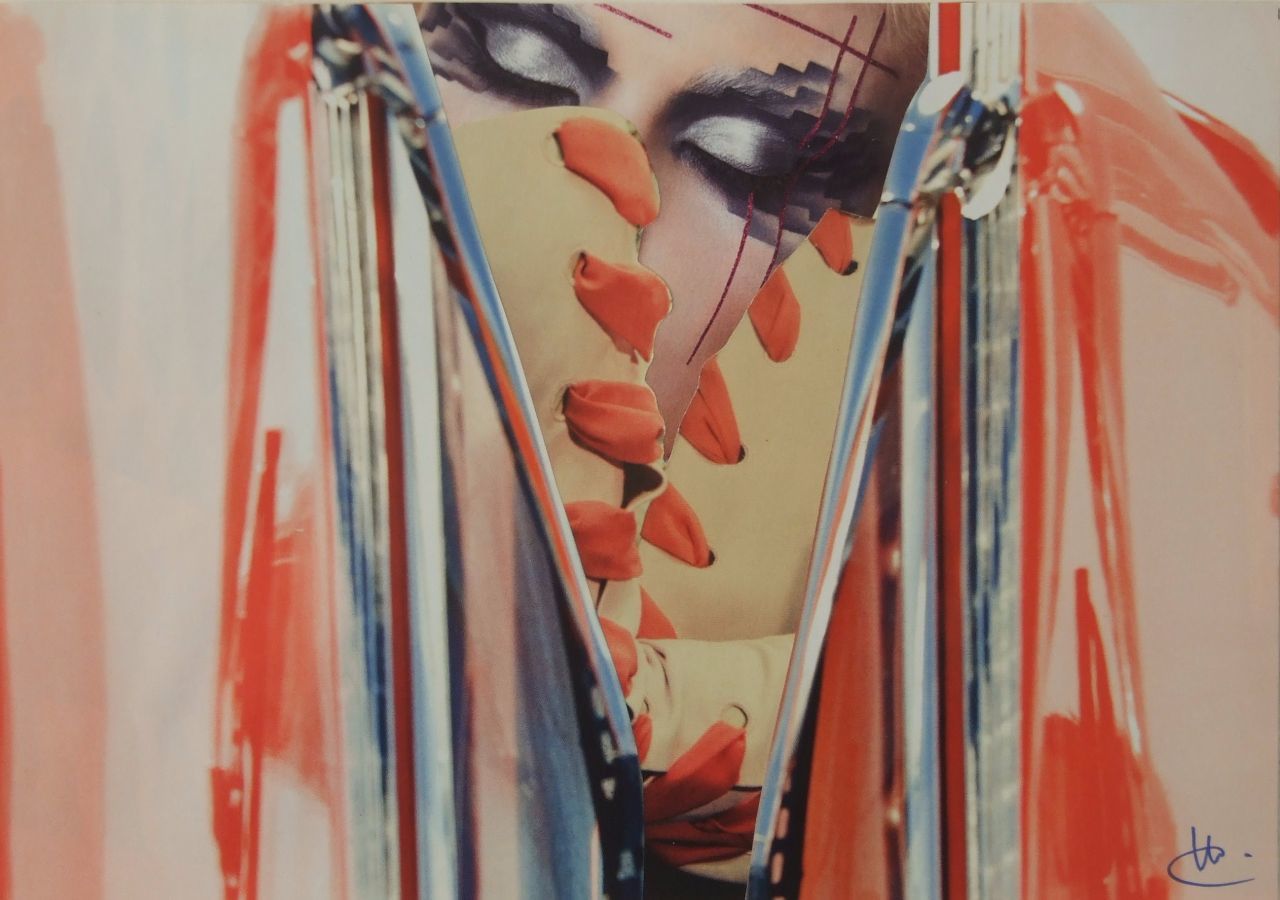 Ik maak papieren collages. Hiervoor gebruik ik tijdschriften, bij voorkeur de meer glossy uitgaven. Ik volg mijn intuïtie en gebruik mijn verstand bij het oplossen van 'problemen' in de verbinding van de papieren onderdelen.