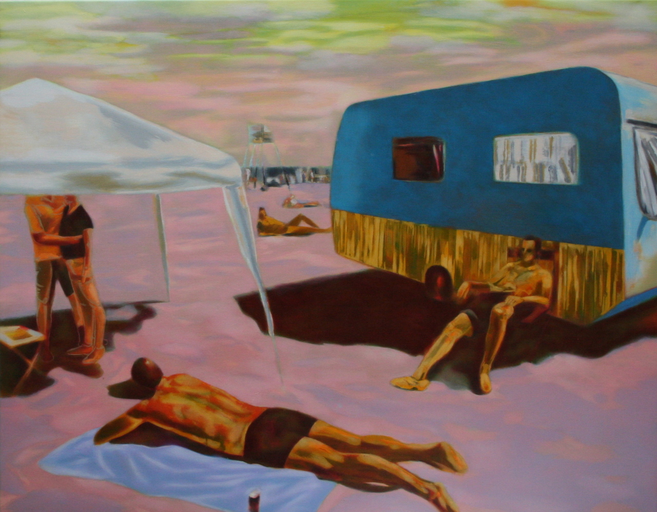 Strand Vakantie Caravan Zonnen Olieverfschilderij Kleur Realisme Figuratief