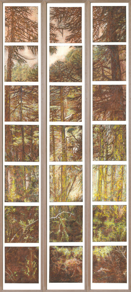 'Sporen' is een drieluik dat gemaakt is met gemengde technieken op papier. Het bestaat uit 21 samengevoegde loodgravures die bewerkt zijn met pastel. In deze serie tekeningen herbezoekt Wim van Loon via zijn werk plaatsen die hij eerder bezocht heeft, in dit geval de bossen in Araucaria, Chili.